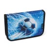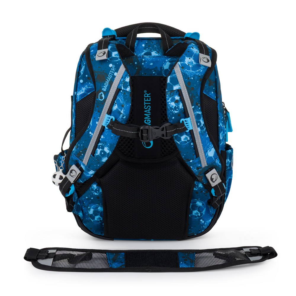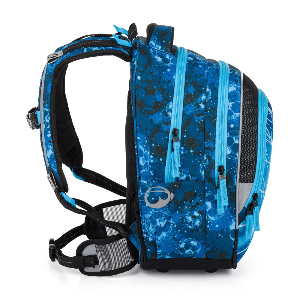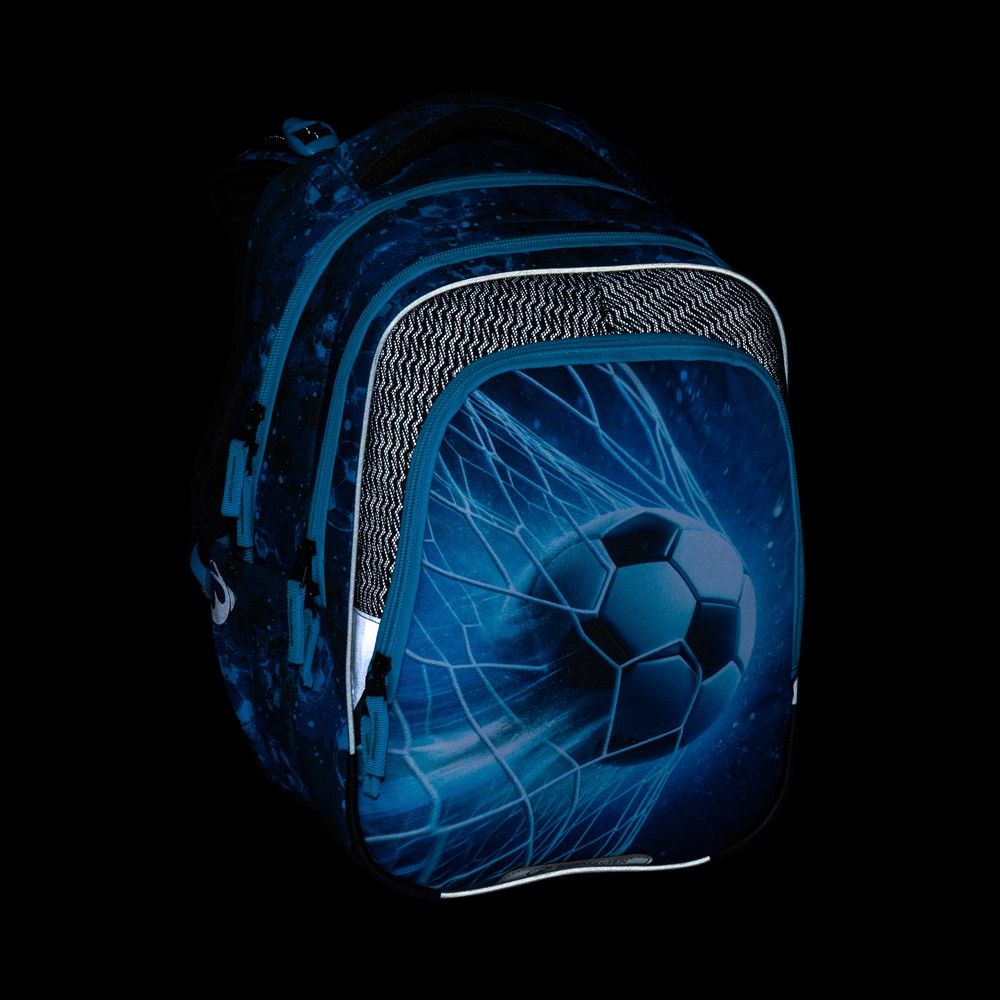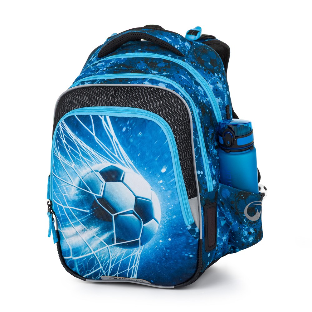 Tříkomorový školní superbatoh pro prvňáčky, kteří mají rádi fotbal a modrou barvu. Váží necelý kilogram, má nový bezpečný zádový systém s bederním pásem, reflexní prvky, praktický organizér i boční kapsu na pití. Síťovina na anatomicky tvarovaných popruzích a zádové části je měkká a neškrábe. Set obsahuje sladěný penál a sáček.