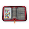 Na dvou otevíravých chlopních je 35 pružných gumových úchytů na pastelky, pera, fixy, gumu, kružítko a další pomůcky.