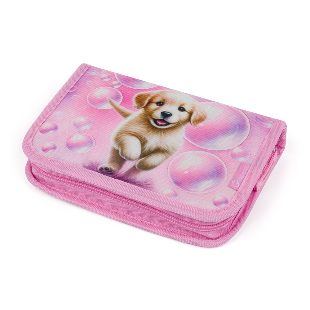 Jemný holčičí penál s pejskem vhodný pro malé školačky na první stupeň. V gumových úchytech na dvou chlopních je dostatek místa na všechny potřebné školní pomůcky. Pouzdro se uzavírá kvalitním zipem. Je lehké a v batohu nezabírá moc místa.