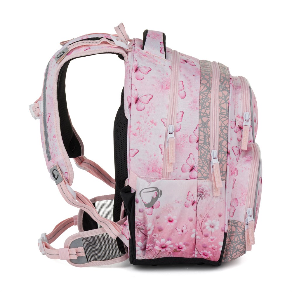 Batoh má spoustu výrazných reflexních prvků, díky kterým bude malá školačka v bezpečí (ze přední strany, po stranách i zezadu na ramenních popruzích). Přesvědčit se můžete tak, že batoh vyfotíte s bleskem.
