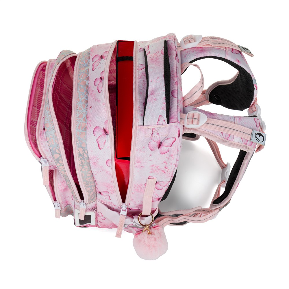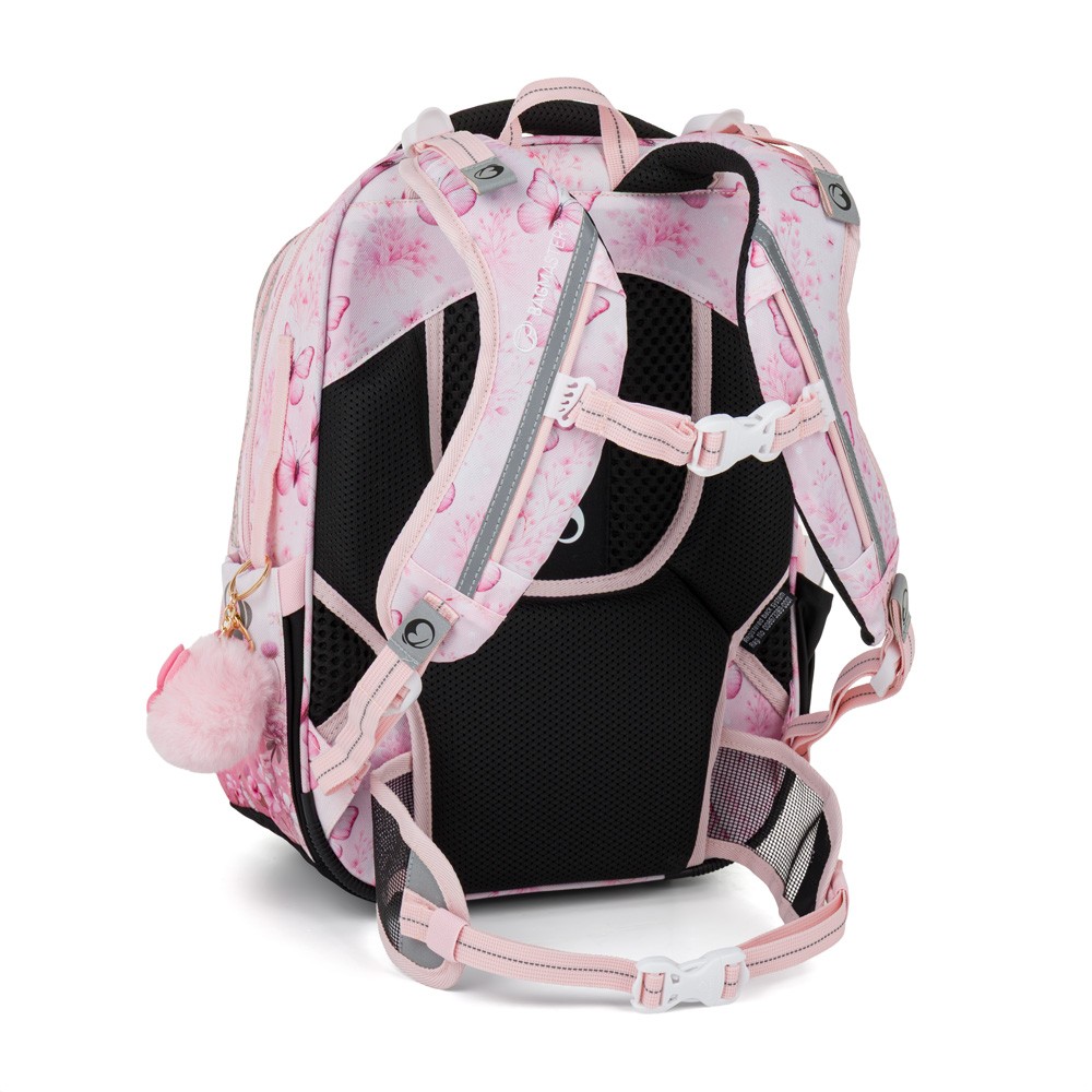 Ramenní popruhy i zádový systém jsou měkce polstrované. Popruhy se nastavují pomocí horních a dolních plastových spon. Je třeba upravovat délku podle toho, jak školačka roste. Celková délka je 36 cm. Konce popruhů jsou magnetické. Aby neblincaly, jednoduše je magnetem připnete nad plastovou sponu.