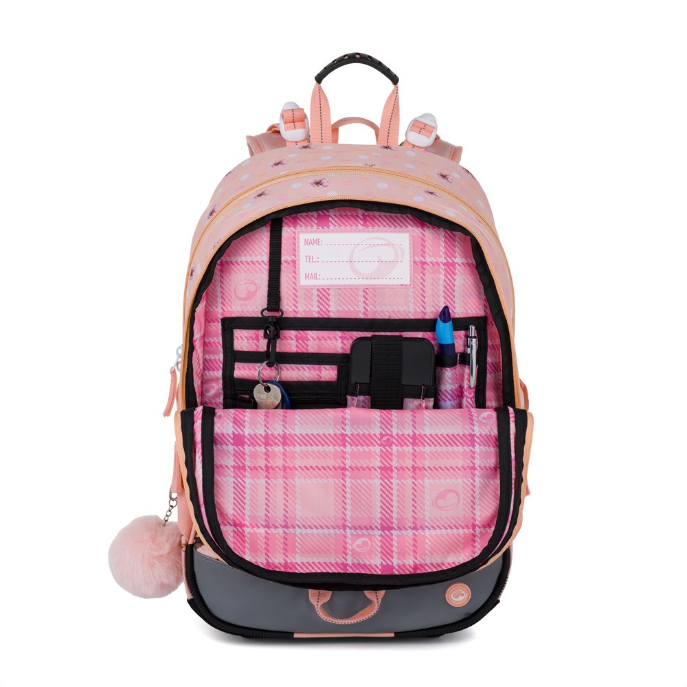 Má tři prostorné komory. Do hlavní se vejdou velké školní desky i učebnice a sešity formátu A4. V hlavní komoře je také organizér na desky A4 a na velké učebnice.