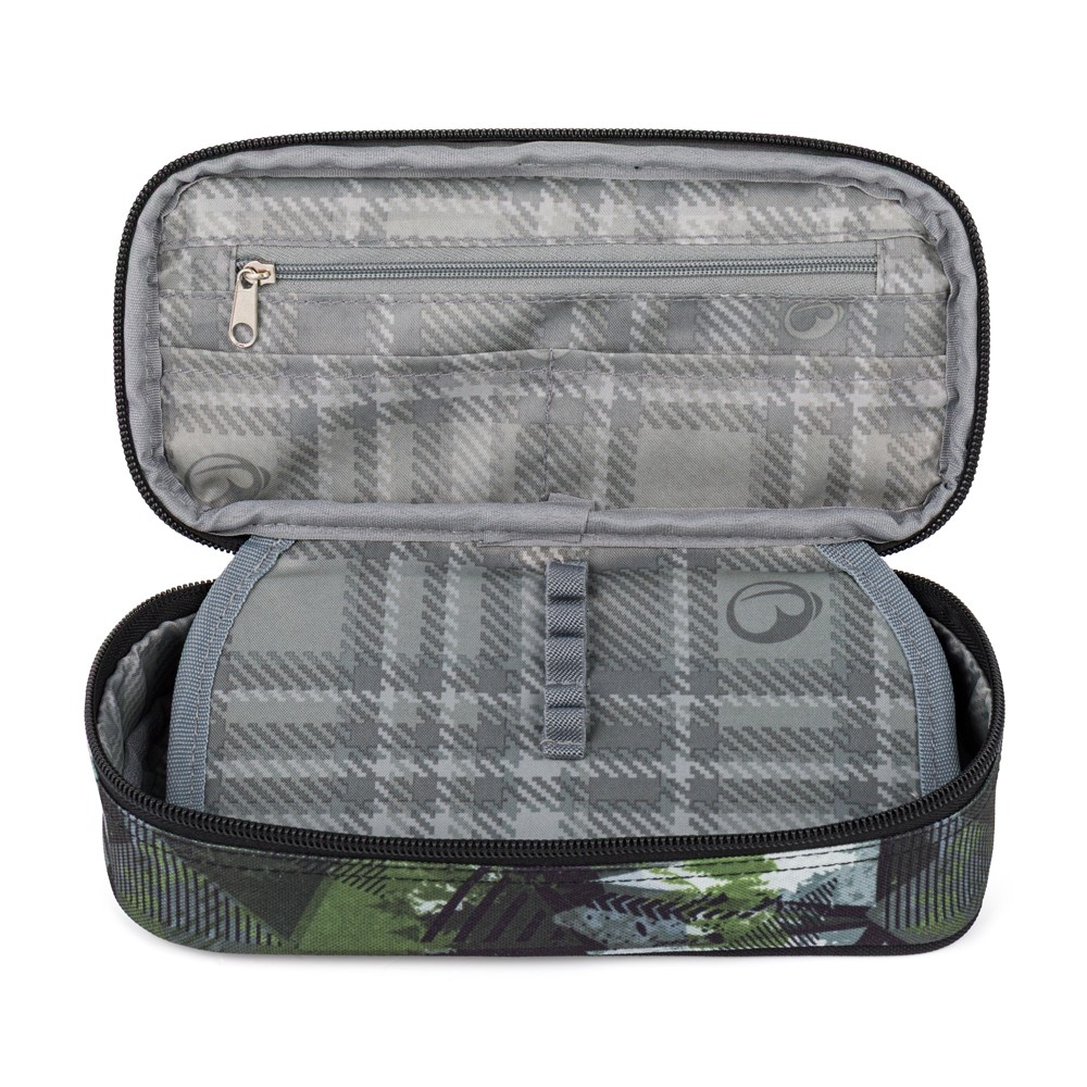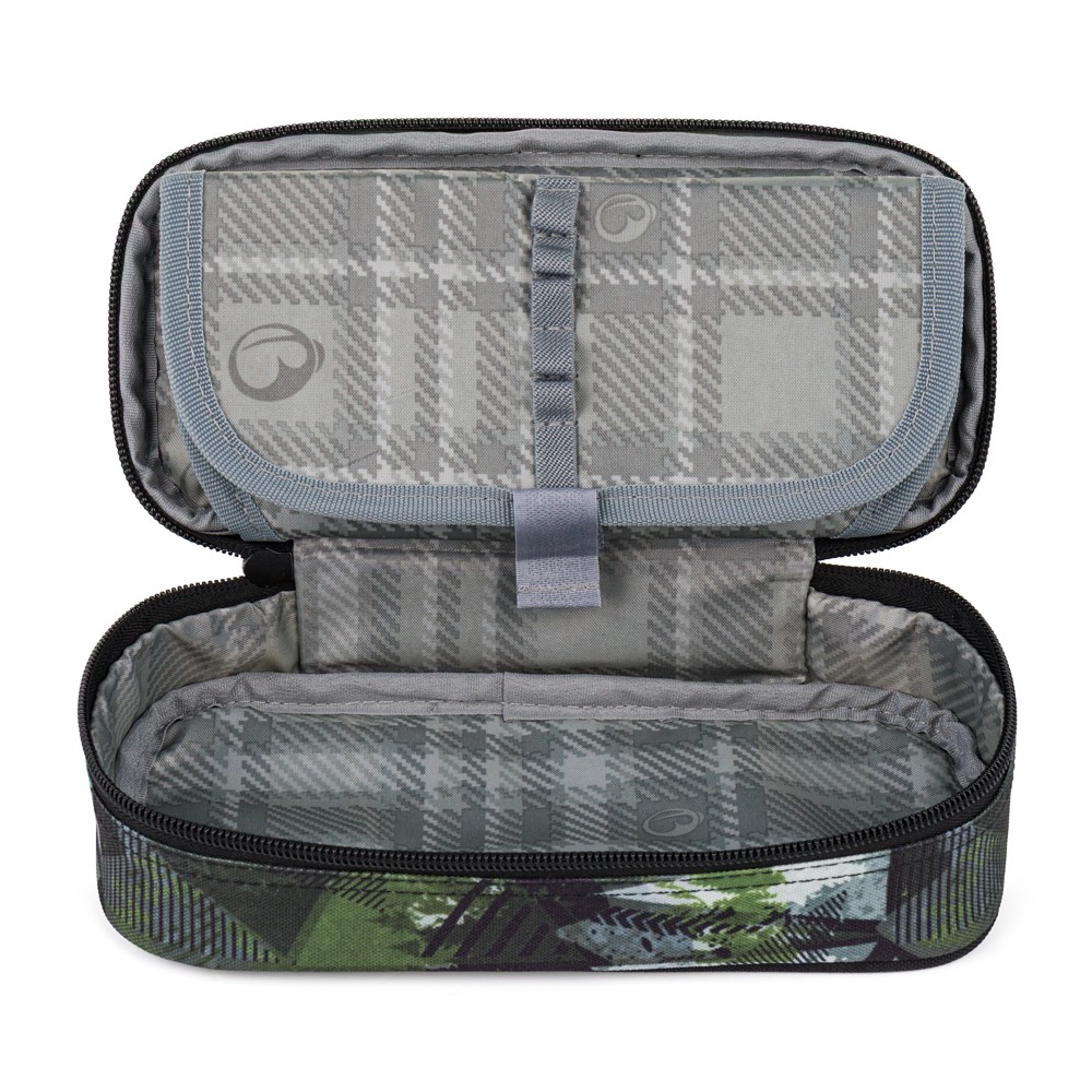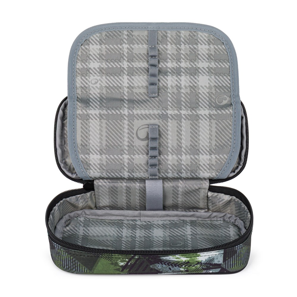 Zeleno-šedý penál pro školáky a školačky. Na dvojité přepážce jsou gumová poutka na psací potřeby, další pomůcky se vejdou do prostoru pod přepážkou. Zapíná se pohodlně zipem s jedním taháčkem.
