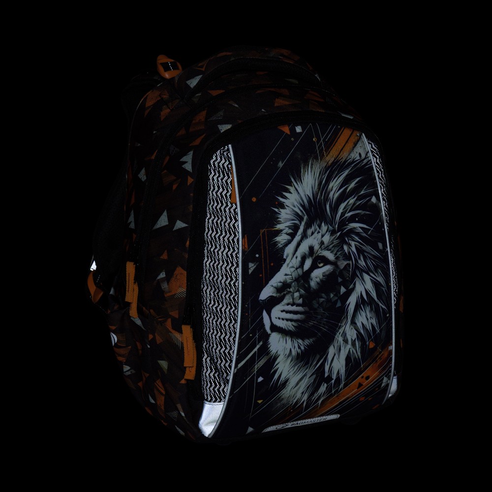 Set s motivem lva pro malé školáky od 1. do 3. třídy. Školní batoh je navržen s ohledem na drobné postavy školáků. Přesto je batoh prostorný, uvnitř jsou dvě komory. Hlavní komora pojme velké desky a učebnice, díky kompresní kapse s elastickými pásy zůstanou těžké pomůcky blízko zad. Správnému držení těla pomáhají také ergonomicky tvarovaná záda a bederní pás. Batoh s motivem lva stojí na plastových nožkách a je opatřen reflexními prvky.